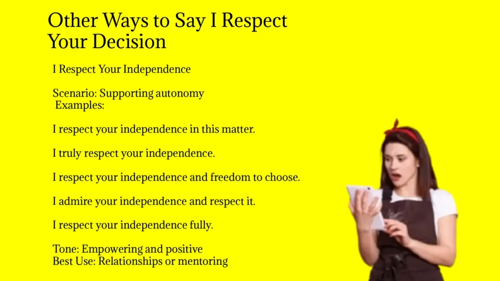 Having multiple ways to say “I respect your decision” allows you to communicate with more clarity, warmth, and emotional intelligence. Whether you’re speaking in a professional setting, resolving a conflict, or supporting someone personally, these 47 alternatives help you express respect in a more natural and meaningful way.
