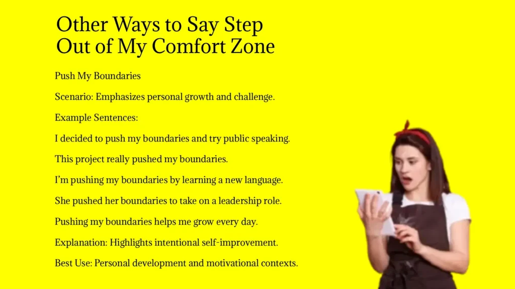 Finding other ways to say “step out of my comfort zone” allows you to express courage, growth, and initiative more creatively. Using varied alternatives keeps your writing, journaling, speeches, or social media posts engaging and inspiring.